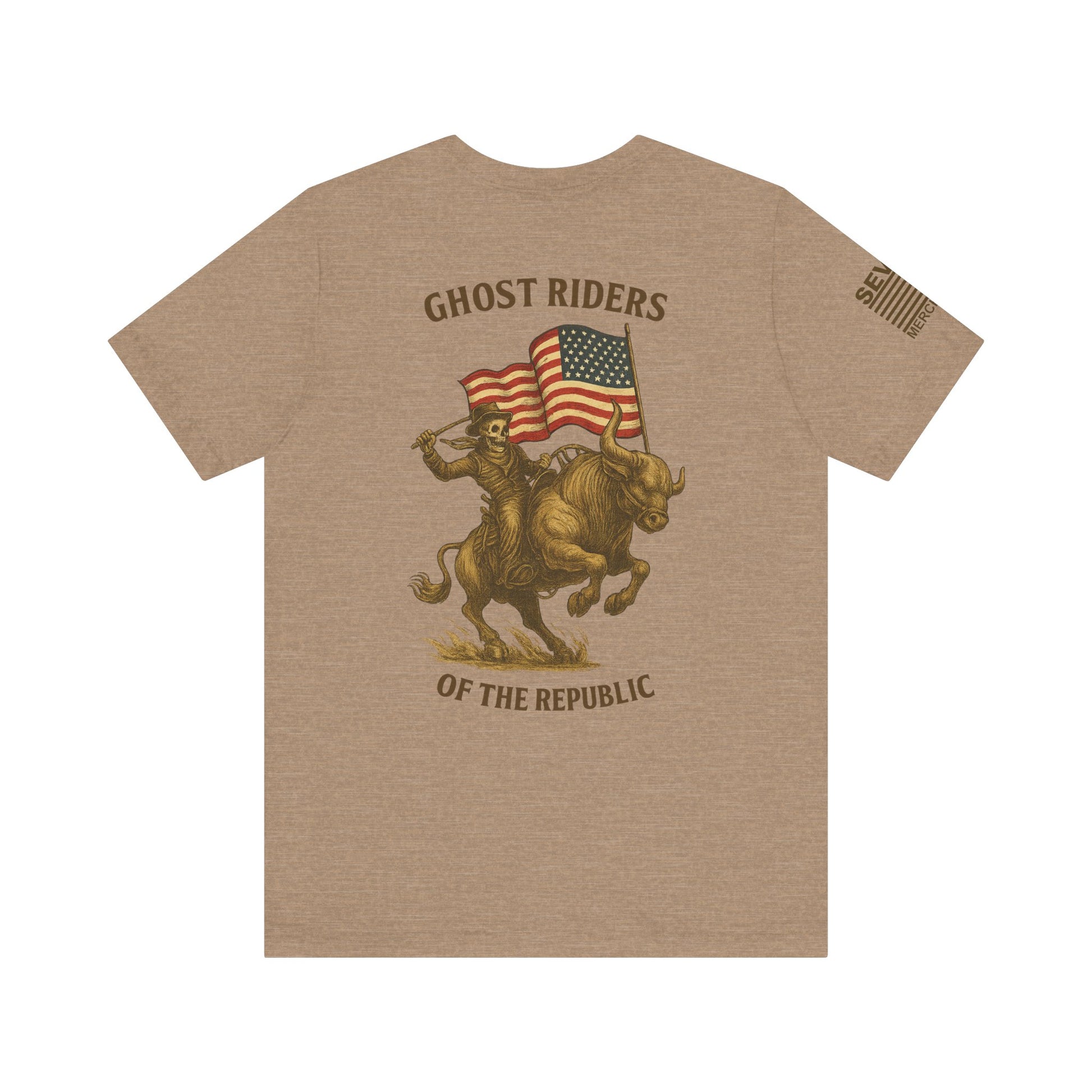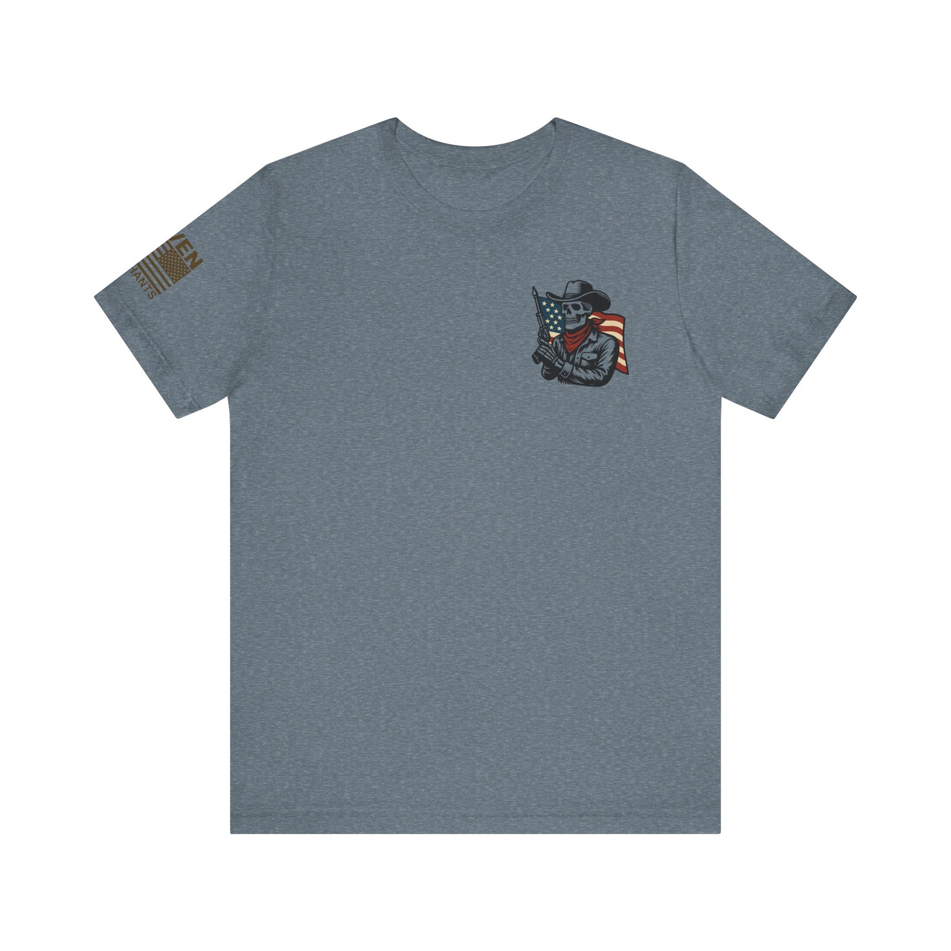 Patriot Rider Tee – Skeleton Cowboy Bull Ride with American Flag Graphic Classic Jersey Short Sleeve Tee